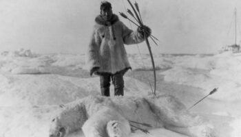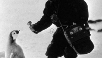Корреспондент берёт интервью у пингвина в Антарктиде, 1966..
