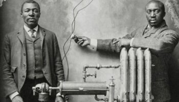 Изобретатель Чарльз С.Л. Бейкер и его помощник демонстрируют..