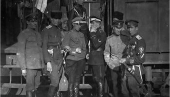 Штабные офицеры белой гвардии у бронепоезда .Полтава ,1919..