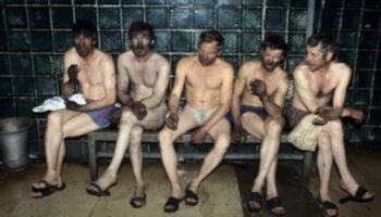 Шахтеры в раздевалке после смены .Кемерово ,1996..