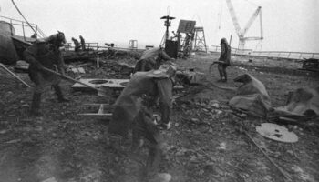 Солдаты советской армии очищают от радиоактивных отходов крышу..