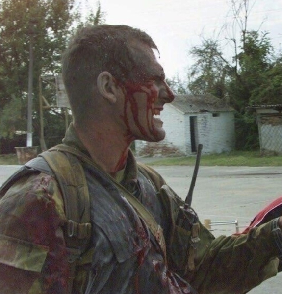 Вопреки своим ранениям, он неоднократно возвращается в школу за детьми. Беслан, 2004 год.